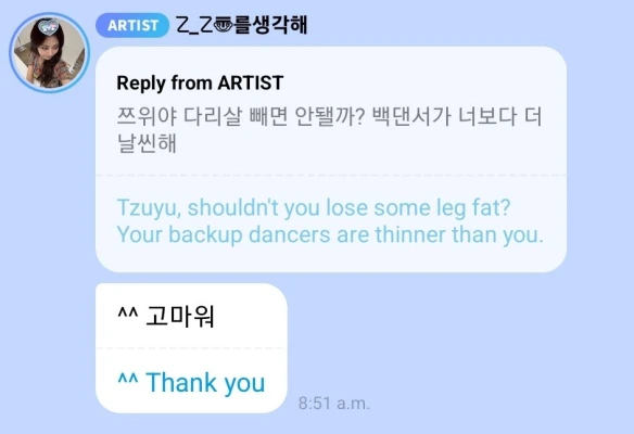 TWICE「ツウィ」が、「痩せろ」とのコメントに返信しています。