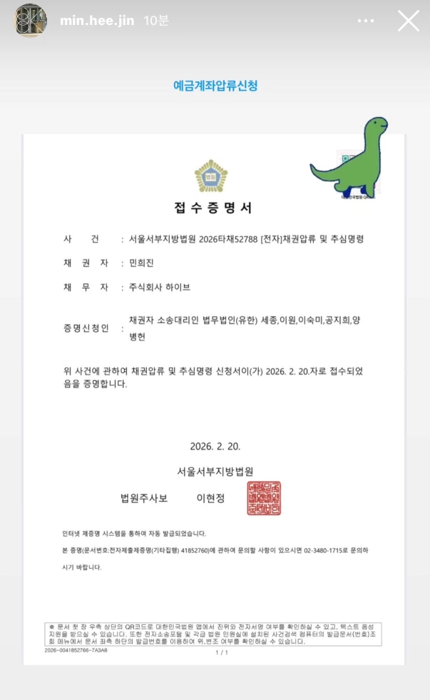 「ミン・ヒジン」が、HYBEに対して、「預金口座差押え申請」を行っています。