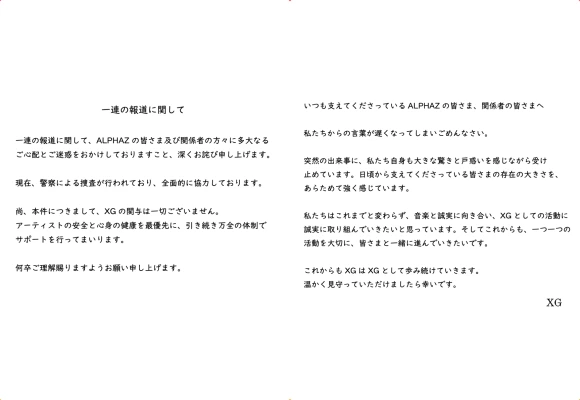 XG側は24日、「本件に関してXGの関与は全くないことを明確に申し上げます」「ALPHAZの皆様をはじめ関係者の皆様に大きな心配とご不便をおかけしたことを心からお詫び申し上げます」と述べた。