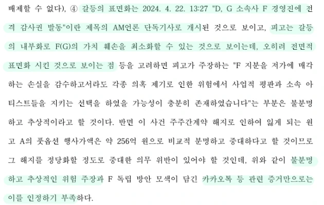 判決文で「対立の表面化は 2024年4月22日13:27『D、G所属事務所 F経営陣に全額監査権発動』というタイトルのメディアの独占記事として掲載されたことから」「被告(HYBE)は対立の内部化によりF(G)(Ador(NewJeans))の価値の毀損を最小限に抑えられたように見えるが、むしろ全面的に表面化させたように見える」「その点などを考慮すると、被告(HYBE)が主張する『F(Ador)の株式を安値で売却する損失を覚悟してでも、さまざまな疑惑の提起によって、リスクから事業の評判と所属アーティストを守る選択をした可能性が十分に存在しました』という部分は不明瞭で抽象的だと言えるだろう」ー