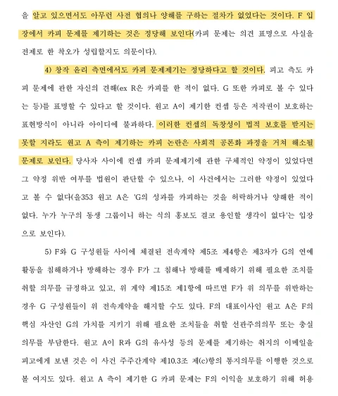 NewJeansとAdor専属契約からも、コピー提起の正当性が認めらた。判決文「G(NewJeans)専属契約 第5条第4項は、第三者がGの芸能活動を侵害または妨害する場合、F(Ador)がその侵害や妨害を排除するために必要な措置を講じる義務を規定しており、上記契約第15条第1項によれば、F(Ador)がその義務を違反した場合、G(NewJeans)の構成員がその専属契約を解除することもできる」ー