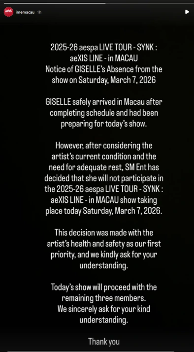 現地イベント会社(iMe Macau)はInstagramを通じて「ジゼルはスケジュールを置けて、マカオに到着。公演のために準備していた」「しかし、現在の体調と休息の必要性を考慮した結果、SMはジゼルの不参加(7日公演)を決定した」「この決定は健康と安全を最優先に考慮してなされたもので、ご理解ください」。
