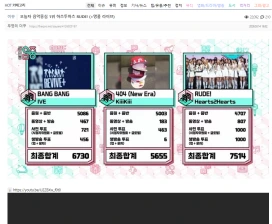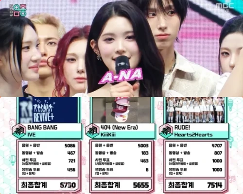 3月14日放送MBC「音楽中心」では、Hearts2Hearts「RUDE!」, KiiiKiii「404(New Era)」, IVE「Bang Bang」が1位候補にノミネート。このうち1位に輝いたのは、Hearts2Hearts!