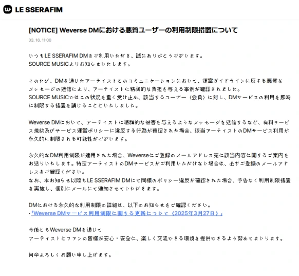 さらに「永久にアーティストDMの利用が制限された会員には、DM商品を購読したWeverseアカウント(メール)で通知し、関連の案内を行う」「したがって、特定のアーティストDMの使用に制限がある場合は、必ずメールを確認してほしい」「本通知以降も同様の運営ポリシー違反が発覚した場合、事前警告なしに利用制限措置を行い、個別のメールで通知・案内を行う」と伝えた。
