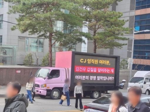 トラックのモニターには「CJ役職員の皆さん、キム・ゴヌのパワハラを隠蔽するのが皆さんの経営理念ですか?」といった文句が。所属事務所の対応を批判している。