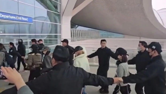 その際の警護の仕方が、物議を醸している。10人ほどのボディーガード達はメンバーを囲うように、手をつないだ。この状態で、出国ゲートまで進んだ。