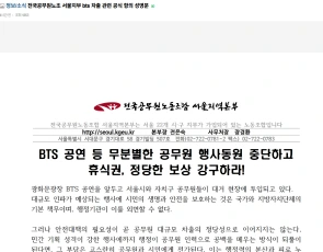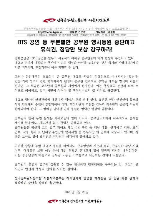 また「労組が継続的に問題を提起してきたにもかかわらず、公務員の行事動員の慣行は制度改善なしに繰り返されている」「週末の大規模動員を行いながらも、勤務命令の基準や範囲、勤務時間手当の支給の有無、代替休暇の保障についての明確な案内すらなく、一方的な指示だけが下されるなら、これは公共行政の名の下に公務員の労働を消耗品として扱うことに他ならない」と述べた。その上で、本来の業務に集中できる行政体制の構築を求めた。