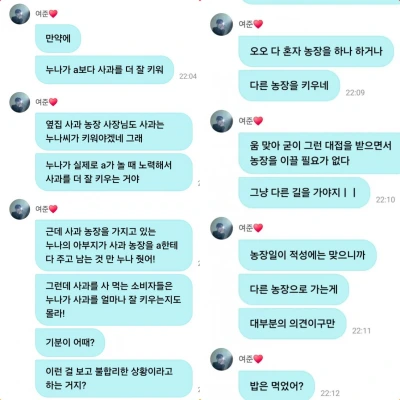 「ヨジュン」は最近、コミュニケーションアプリを更新。「もし、ヌナがAよりリンゴを上手く育てて、隣のリンゴ農場の社長も『リンゴがヌナが育てるべきだ』と言ったとする」と、例え話を切り出しました。