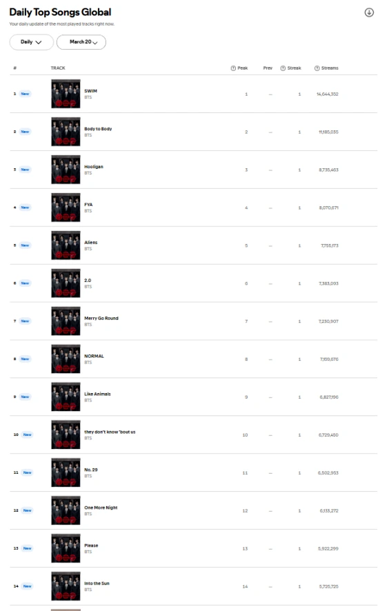 20日付グローバルチャート(Daily Top Songs Global)をみると、1位になったタイトル曲「Swim」を含む14曲が、上位14位まで独占する快挙を達成しています。