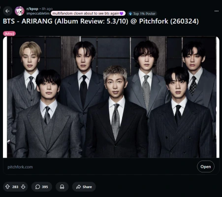 BTS「アリラン」、米ピッチフォーク「5.3点」厳しい評価「ジェネリック…彼らの崩壊の響き」
