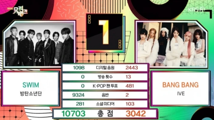 3月27日放送KBS「ミュージックバンク」では、BTS「Swim」とIVE「Bang Bang」が1位候補にノミネート。このうち1位に輝いたのは、BTS!