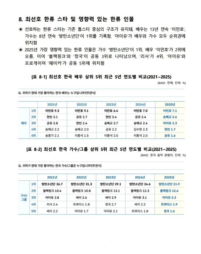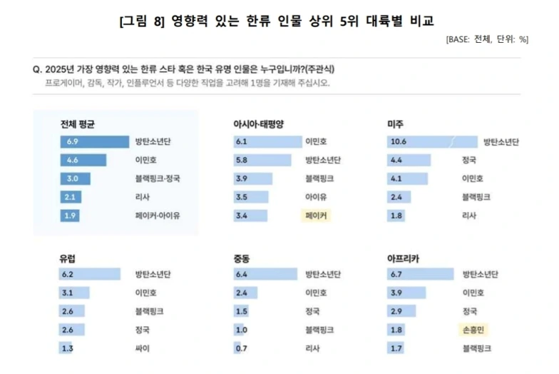 「最も影響力のある韓流スター」項目では、「BTS」が6.9%で首位を占めた。続いて、イ・ミンホ(4.6%)、BlackPink・BTSジョングク(3.0%)、BLACKPINKリサ(2.1%)、Faker・IU(1.9%)。