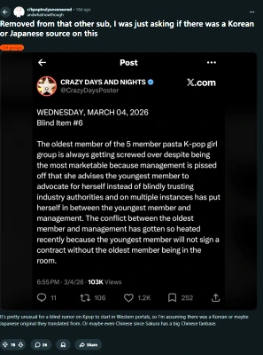 ゴシップアカウント「Crazy Days and Nights」に、「K-POP女性グループ」に関する噂が投稿されています。