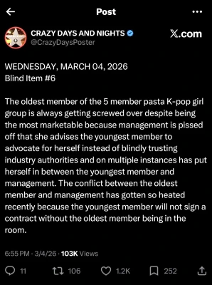 同アカウントは3月4日、「5人組K-POPガールズグループ」のこととして、「最年長メンバーは、いつも冷遇されている。最も需要があるのに」とし、このメンバーは、会社側との関係が悪化しているという。