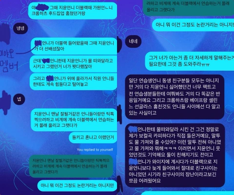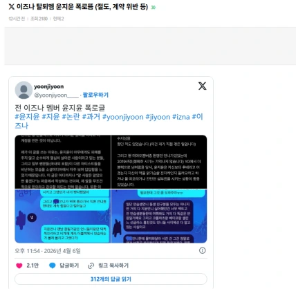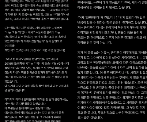 暴露アカウントは「この時期に一緒に練習生生活を送っていた後輩との会話内容を公開します。その他にも、iznaメンバーに被害を与えた件に関しては、契約違反など別の問題がありました」「これらの点は現在アイドルとして活動している知り合いのオンニに直接会って、一緒に食事をしながら聞いた話です。私が聞いた中で、あのオンニに被害が行かない線や、法的に関係会社の方々が困ることになる内容は控えて、この記事を書きます」