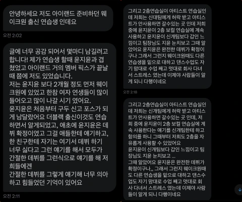 「そして2階練習室がアーティスト練習室だったが、私たちは許可をもらってアーティストが使わない時に行っていた。ユン・ジユンは2階ボーカル練習室を継続して使用していた。ジユンが会社より「甲」な感じで、チーム長もジユンの顔色をうかがっていた。その時知りました、ユン・ジユンは完全なデビューが確定なのだなと。だからかWakeoneの時も他の練習生を下に見て、ダンスの授業も自分勝手に授業をサボって適当に会社に通ってストレスだったけど、今になって人々に知れ渡ってよかったですね」