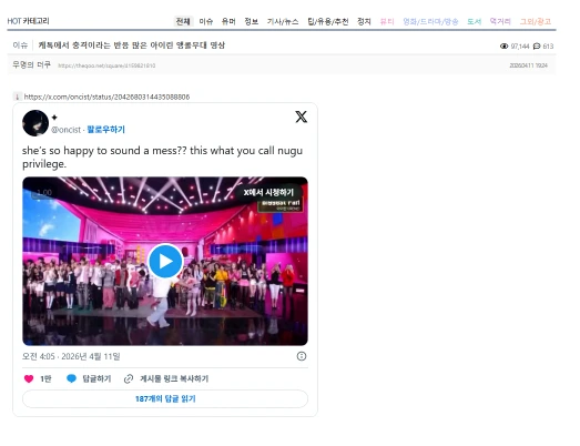 しかし、不安定な歌唱を披露した。音程を取ることに終始苦労している様子。自身も音を外していることを自覚しているようで、失笑したり歌うのを止める瞬間がみられている。キャリア10年を誇り「歌下手イメージ」がなかっただけに、このステージは韓国・海外K-POPの間で反響を呼んでいます。