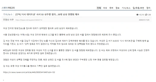 女性BJは「『性的接触しない』と約束し、家に行った後に強姦しようとした」と主張。トイレに避難した女性が警察に通報し、逮捕に至った。一方、男はBJとの「食事デート券」を購入し、飲酒の席を設けたと説明。身体的接触の事実は認めているものの、強制性はなかったと反論したと伝えられている。警察は男を調査し、拘束令状の申請の有無などを検討する。