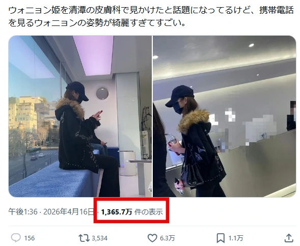 ホーム / SNS/バイラル / IVEウォニョン、「皮膚科」写真に反響!「姿勢良さ」に感心 SNS/バイラル IVEウォニョン、「皮膚科」写真に反響!「姿勢良さ」に感心 時 2026/4/19 19:19 (3時間前) コメント 9 コメント IVE「ウォニョン」が、「皮膚科」クリニックで目撃されています。 場所は、清潭にある「AMRED」というクリニックだという。「美容に気を使っている」K-POPアイドルだから、「皮膚科」に通っていることは不思議な事ではないが、この写真は「1300万ビュー」以上を記録し、バズっています。 反応を見てみると注目された理由は、「姿勢」。院内で座っている写真では、背中をまっすぐにして、スマホをみている。足を組んだりせずに、綺麗な「姿勢」を保っている。人が多くないところでの姿で、「ウォニョン」の意識の高さが垣間見えたとして反響を呼んでいるようです。