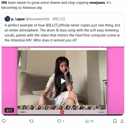 さらに、映像の雰囲気についても「ILLITが1つだけではなく、全体的な雰囲気までパクっている良い事例。Drum & Bass曲に、イージーリスニングボーカル, AttentionのMVにあるフェイスタイムシーンの組み合わせ」と言った声も。