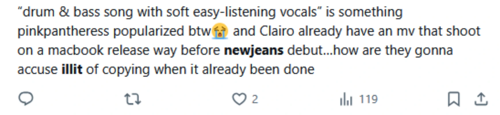 一方で、「Drum & Bass曲にイージーリスニングボーカルは、Pinkpantheressが火付け役。Clairoはすでに、マックブックで撮ったMVを出している。NewJeansより先に」と反論する声も聞かれています。