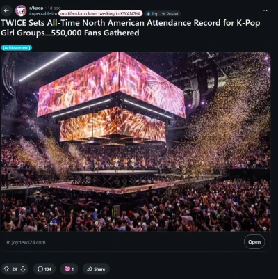 ▼「これが当たり前のことだと思わない方がいい。TWICEみたいなグループは、何世代かに1組だ。55万人はクレイジーだ。第4世代(IVE, aespa, Le Sserafim, itzy, babymonster)の北米ツアーチケットを合計して、2倍にしても55万人にならない」
