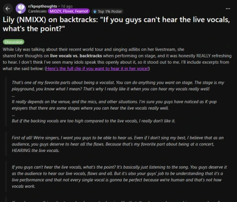 リリーは「生歌に対してバック音源(被せ)が大きすぎるのは、本当に好きじゃない」「まず第一に、私たちは歌手。皆さんに私たちの声をしっかり聴いてほしい。たとえ最高の歌声じゃなかったとしても、観客である皆さんは、その「欠点」も含めてすべてを聴く権利があると思う」ー