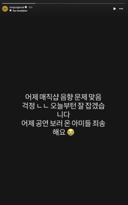 ジョングクは27日、Instagramストリーを通じて「昨日の『マジックショップ』の音響問題は、その通りだ」「心配しないで」と、音響問題があったと釈明。