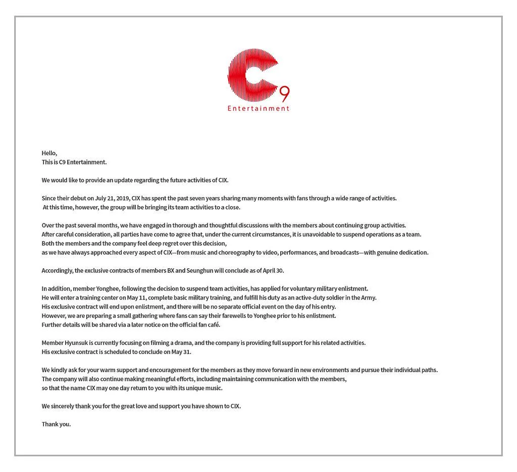 続いて「メンバーとチーム活動を継続するために数か月にわたり真剣かつ深い議論を重ねたが、現時点ではチームの運営を止めることが不可避という結論に全員が同意した」「CIXというブランドに真心を込め、音楽・振付・映像・公演・放送などすべての作業に最善を尽くしてきたので、メンバーと当社は今回の決定を非常に残念に思っている」と伝えた。