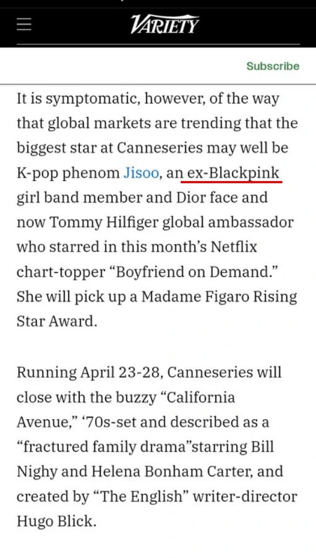 BlackPink「ジス」が、国際テレビドラマ祭「カンヌシリーズ」に出席することが決定。Netflix「マンスリー彼氏」主演で、「Madame Figaro Rising Star Award」を受賞する。