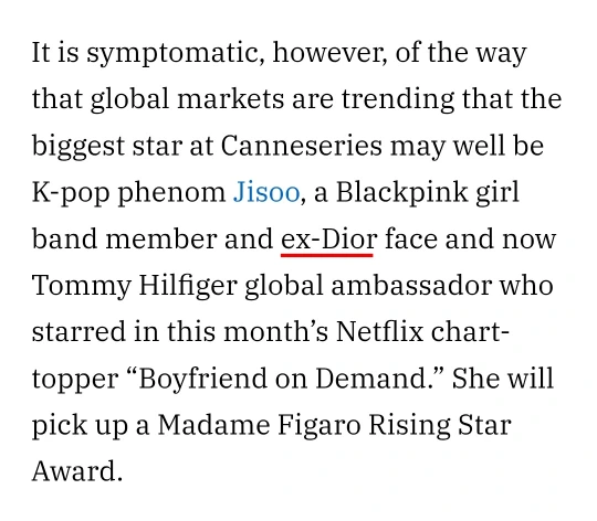 ただ、4月2日(13時)現在、記事を見ると「ex-」の文字が消えている。これは「間違い」だったよう。ちなみに、「ディオール・フェイス」についても「ex-」が付けられたが、こちらも訂正済みです。「ジス」は最近行われたパリコレに、「Dior」アンバサダーとして出席したばかりです。